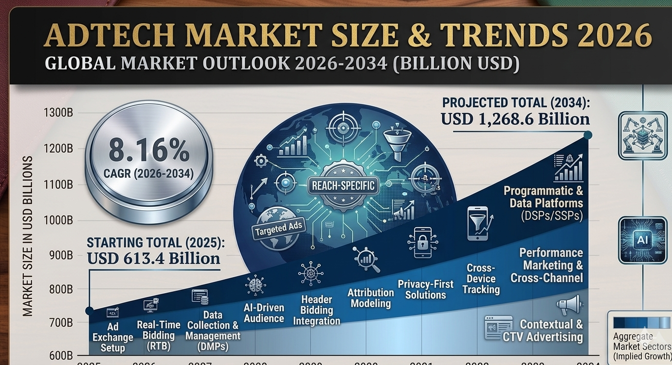 According to a research report by IMARC Group, the global AdTech market size was valued at USD 613.4 Billion in 2025. Looking forward, the market is projected to reach USD 1,268.6 Billion by 2034, exhibiting a growth rate (CAGR) of 8.16% during 2026–2034. North America currently dominates the AdTech market with over 35.6% share in 2025, driven by advanced digital infrastructure, high internet penetration, strong user engagement, and a robust regulatory environment. Globally, the market is being propelled by the widespread adoption of AI and machine learning, growing demand for programmatic advertising, and the expanding footprint of smartphones and social media platforms.