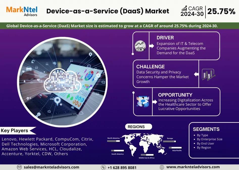 MarkNtel Advisors, a leading market research and consulting firm, has announced the release of its latest study titled Device-as-a-Service (DaaS) Market Research Report: Forecast (2024–2030). This report provides a detailed assessment of the Device-as-a-Service (DaaS), covering its evolving dynamics, emerging trends, key growth drivers, major challenges, and competitive landscape.