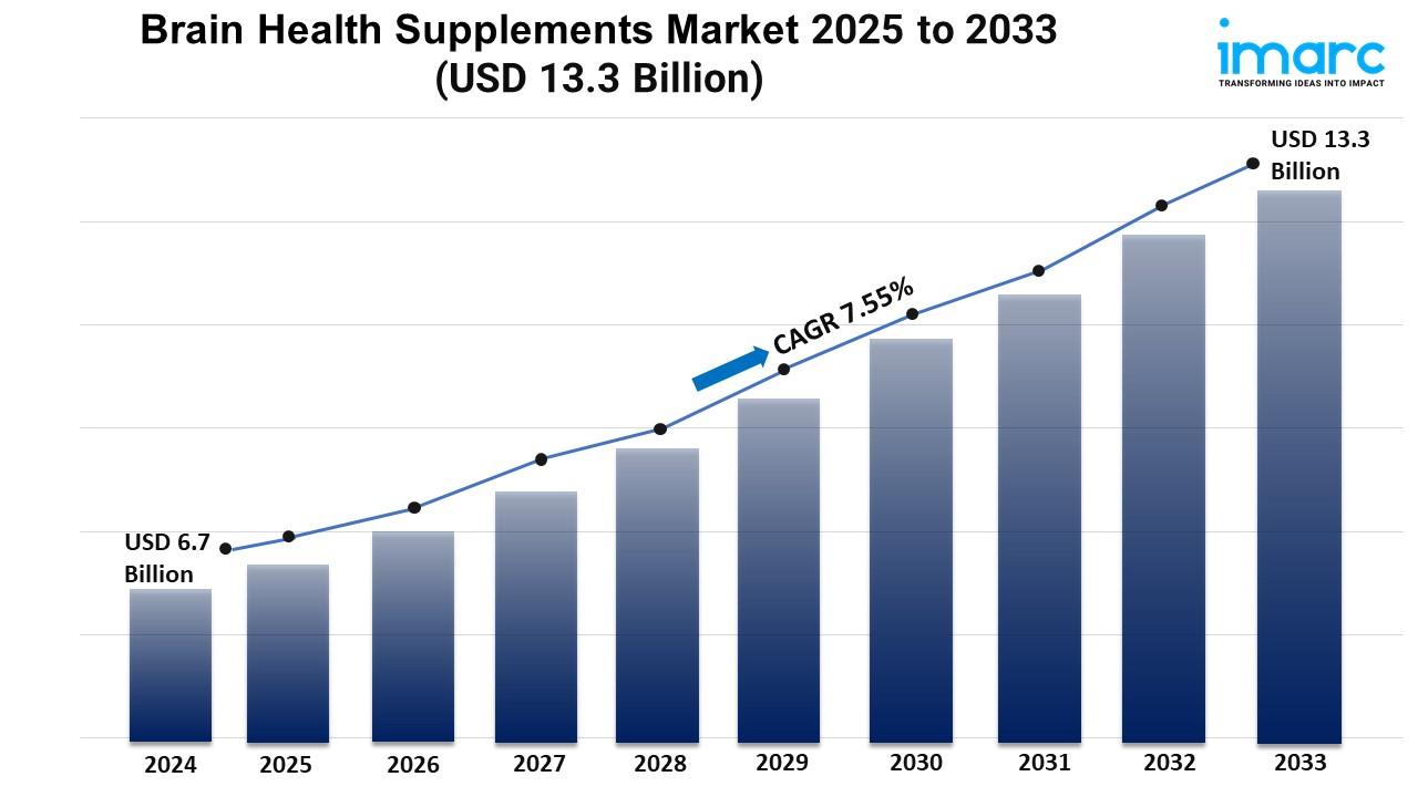 According to IMARC Group's latest research publication, "Brain Health Supplements Market: Global Industry Trends, Share, Size, Growth, Opportunity and Forecast 2025-2033", The global brain health supplements market size reached USD 6.7 Billion in 2024. Looking forward, IMARC Group expects the market to reach USD 13.3 Billion by 2033, exhibiting a growth rate (CAGR) of 7.55% during 2025-2033.