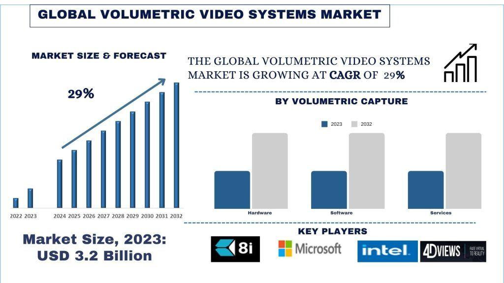 According to the UnivDatos, the increasing technological advancements have been a primary driver of the Volumetric Video Systems market. Continuous advancements in volumetric capture, processing, and display technologies drive innovation in the market. As per their “Volumetric Video Systems Market” report, the global market was valued at USD 3.2 Billion in 2023, growing at a CAGR of 29% during the forecast period from 2024 - 2032 to reach USD Billion by 2032.