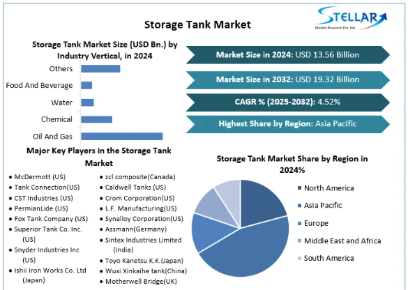 Storage Tank Market was valued nearly US$ 13.56 Bn. in 2024. Global Storage Tank Market size is estimated to grow at a CAGR of 4.52% and is expected to reach at US$ 19.32 Bn. by 2032.