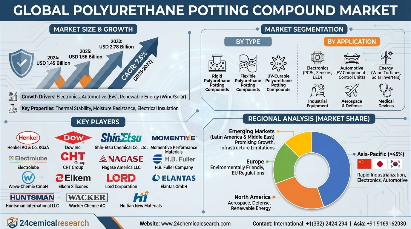 Global polyurethane potting compound market size was valued at USD 1.45 billion in 2024. The market is projected to grow from USD 1.56 billion in 2025 to USD 2.78 billion by 2032, exhibiting a CAGR of 7.5% during the forecast period. This upward trajectory is primarily fueled by increasing demand from the electronics, automotive, and renewable energy sectors, where robust encapsulation solutions are critical for protecting sensitive components from environmental stressors.