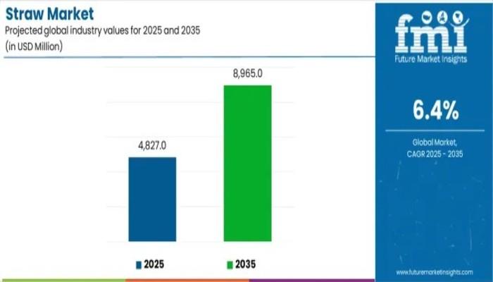 The global straw market is entering a transformative decade marked by rapid material innovation, strong regulatory momentum, and increasing beverage consumption across food service, retail, healthcare, and hospitality sectors. Valued at USD 4,827 million in 2025, the market is forecasted to reach USD 8,965 million by 2035, recording a robust CAGR of 6.4%. This growth reflects the accelerating global shift toward sustainable drinking accessories and environmentally compliant beverage service systems.