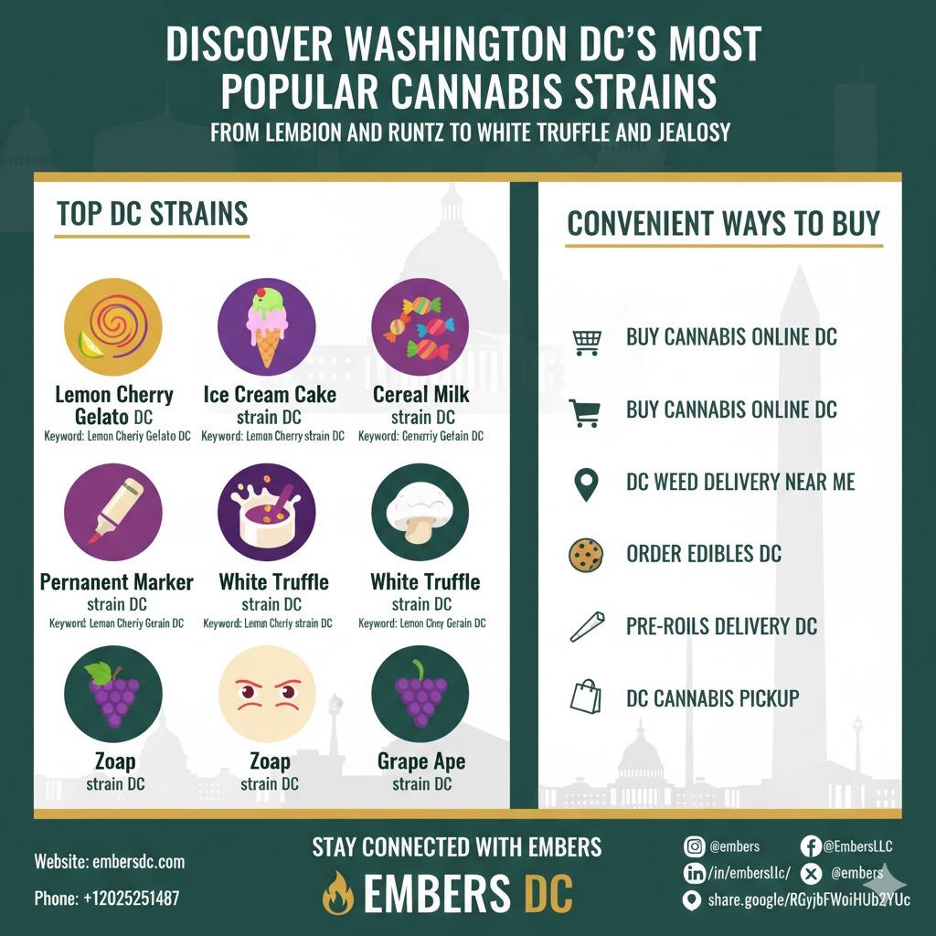 Discover Washington DC’s most popular cannabis strains — from Lemon Cherry Gelato and Runtz to White Truffle and Jealousy. This visual guide highlights the top DC strains, along with convenient ways to buy cannabis online, order edibles, and explore DC dispensary menus. Whether you’re searching for weed delivery near me or pre-rolls delivery in DC, this infographic connects you to premium options and trusted services in the capital’s cannabis scene.