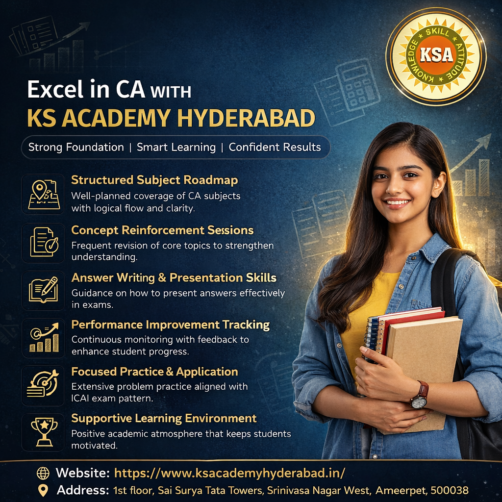 KS Academy Hyderabad is counted among the trusted ca coaching centres in Hyderabad for its disciplined approach and concept-based teaching. Recognized as a ca best institute in Hyderabad, it offers a structured academic plan that helps students understand subjects clearly and prepare confidently for ICAI exams.