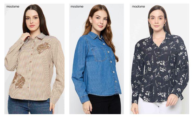Explore the best selection of shirts for women online at Madame and find styles that match every mood and occasion. Choose from women shirts such as printed shirts, striped shirts, denim shirts, formal shirts and sleeveless shirts that keep your style effortless. Every shirt for women is crafted to offer comfort with trend forward details.