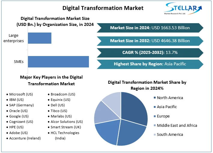 The global Digital Transformation Market is experiencing an unprecedented surge, fundamentally redefining how businesses operate, innovate, and deliver value. Valued at a colossal $1,663.53 billion in 2024, the market is projected to expand at a compound annual growth rate (CAGR) of 13.7%, reaching a staggering $4,646.38 billion by 2032. This explosive growth is powered by a powerful imperative across all industries to integrate digital technologies, optimize costs, and build resilient, data-driven operations in the wake of global disruptions.